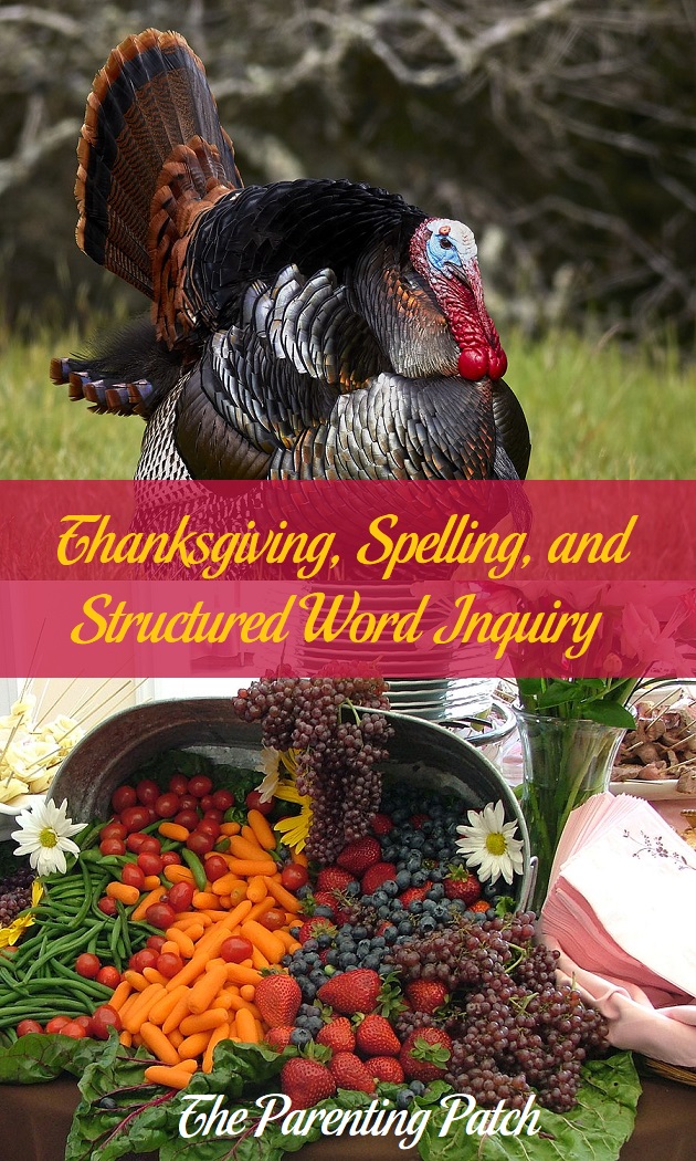 Thanksgiving, Spelling, and Structured Word Inquiry: https://commons.wikimedia.org/wiki/File:Male_wild_turkey_(Meleagris_gallopavo)_strutting.jpg and https://commons.wikimedia.org/wiki/File:Cornucopia_of_fruit_and_vegetables_wedding_banquet.jpg